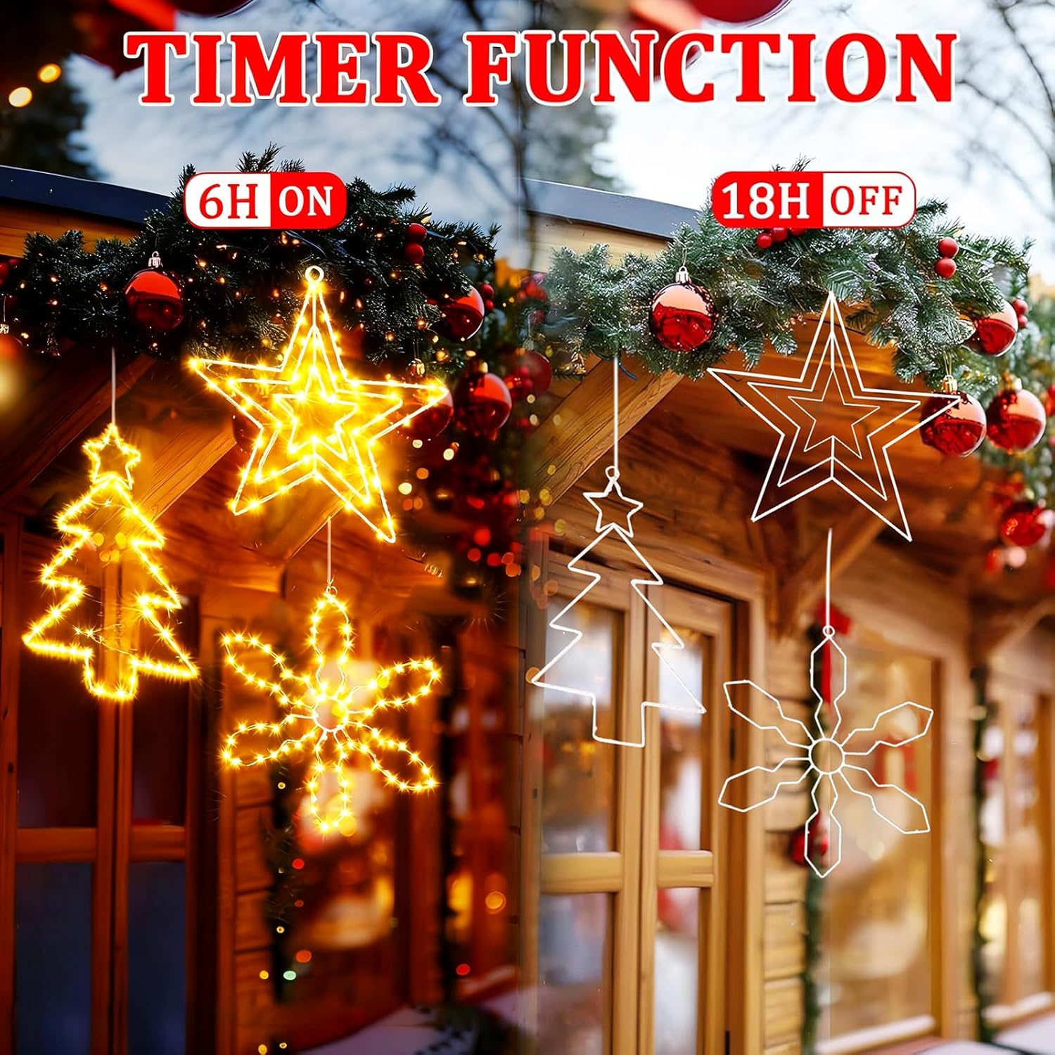 - 4 Light Modes & Timer Function - 4 different lighting modes with memory function and timer allow you to customize the ambience and set the perfect mood for your celebrations. When the "TIMER" mode is activated, the Christmas hanging lights will stay on for 6 hours, then switch off and turn on automatically after 18 hours