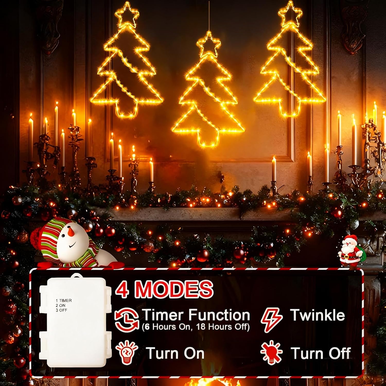 - Christmas Window Lights - 3 separate battery powered window star/tree/snowflake lights designed with metal rods and LED strings, Hanging these sparkling Xmas decorations on your window, wall or door can create a warm feeling and festive atmosphere during your Christmas holiday