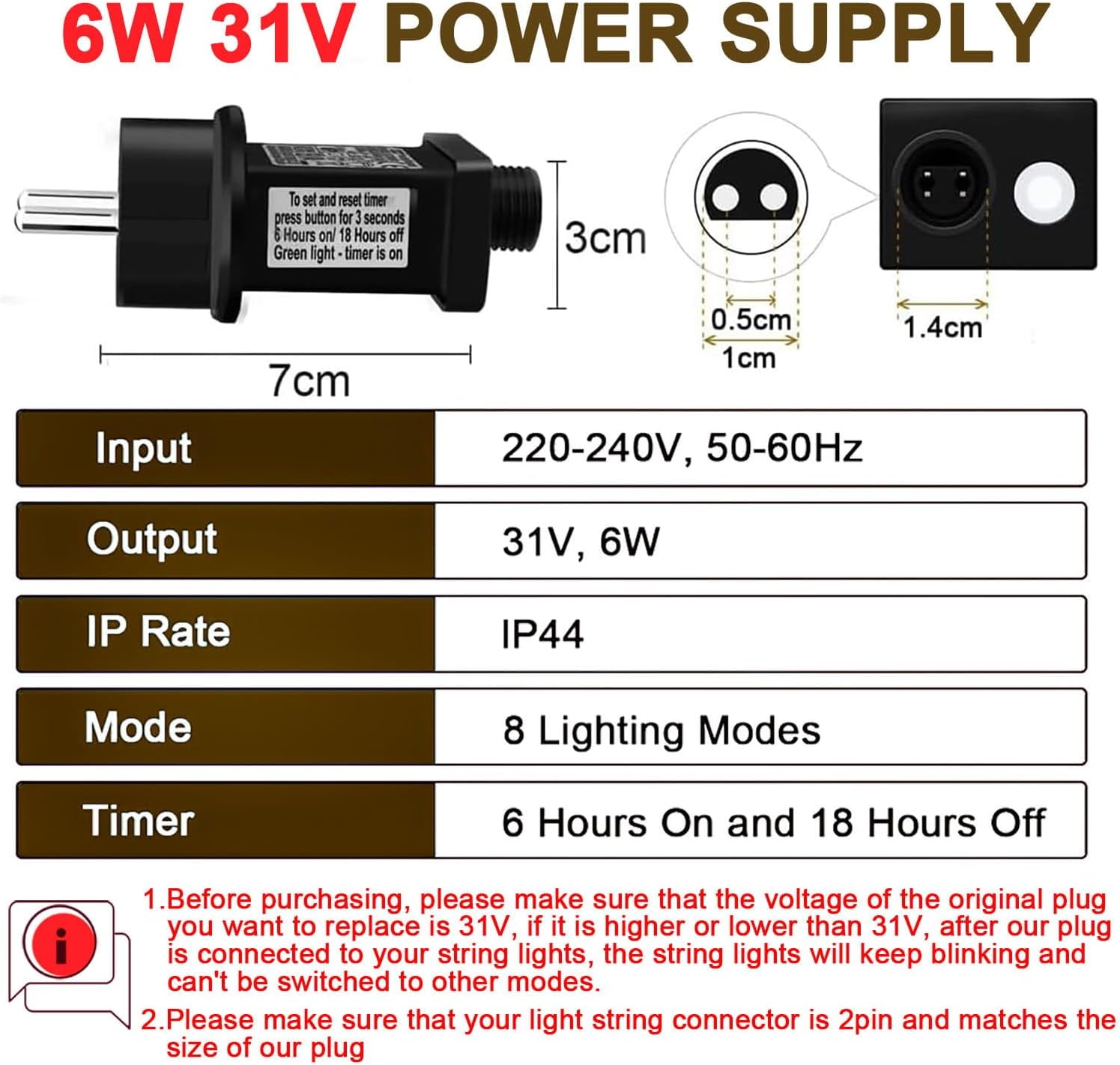 Hohe Qualität: Eingang: 220V-240V/50-60Hz, Ausgang: 31V, Nennleistung: 6W, IP44 Wasserdichtes Design, kann bis zu 1800 LEDs betreiben. Der Transformator für Lichter hat Überspannungsschutz, Überstromschutz und Kurzschlussschutz, sicherer und stabiler Betrieb, geeignet für die meisten Lichterketten, Weihnachtsbeleuchtung, ichtervorhang, Lichterkette Eisregen