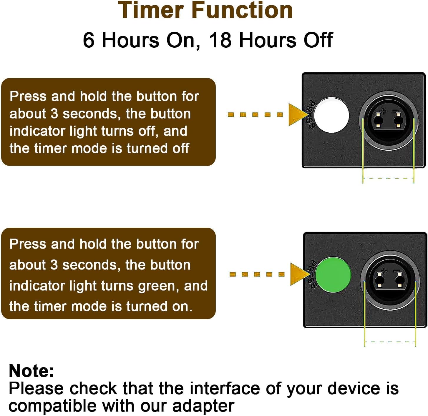 Timer-Funktion & Speicherfunktion: Drücken Sie die Taste 3 Sekunden lang, um die Timerfunktion einzustellen oder abzubrechen, die Kontrollleuchte leuchtet grün und der Timermodus ist eingeschaltet (6 Stunden an/ 18 Stunden aus), die Kontrollleuchte erlischt und der Timermodus ist ausgeschaltet. Der Speicherchip speichert die letzte Moduseinstellung, so dass Sie den Modus nicht jedes Mal neu einstellen müssen.
