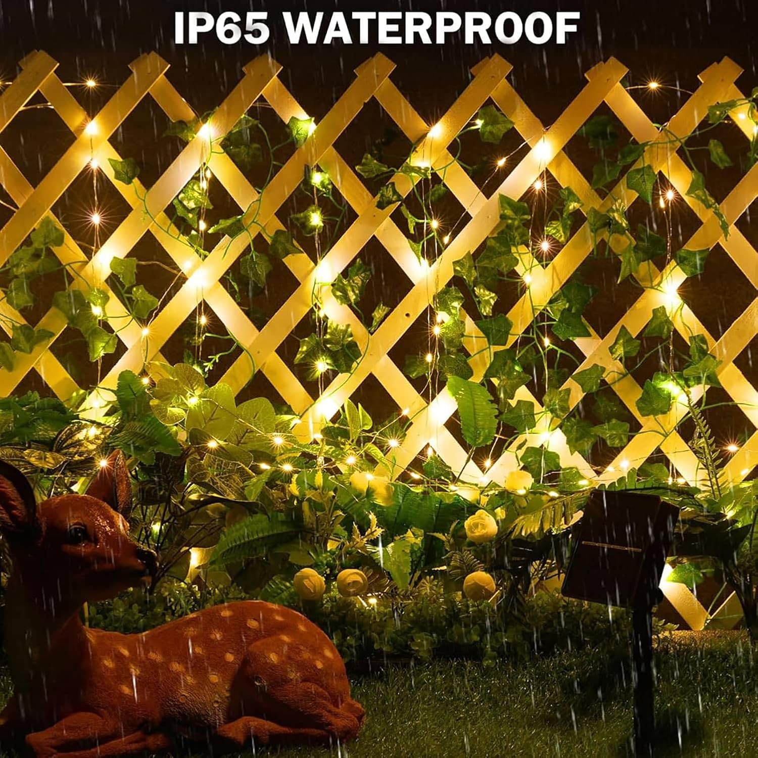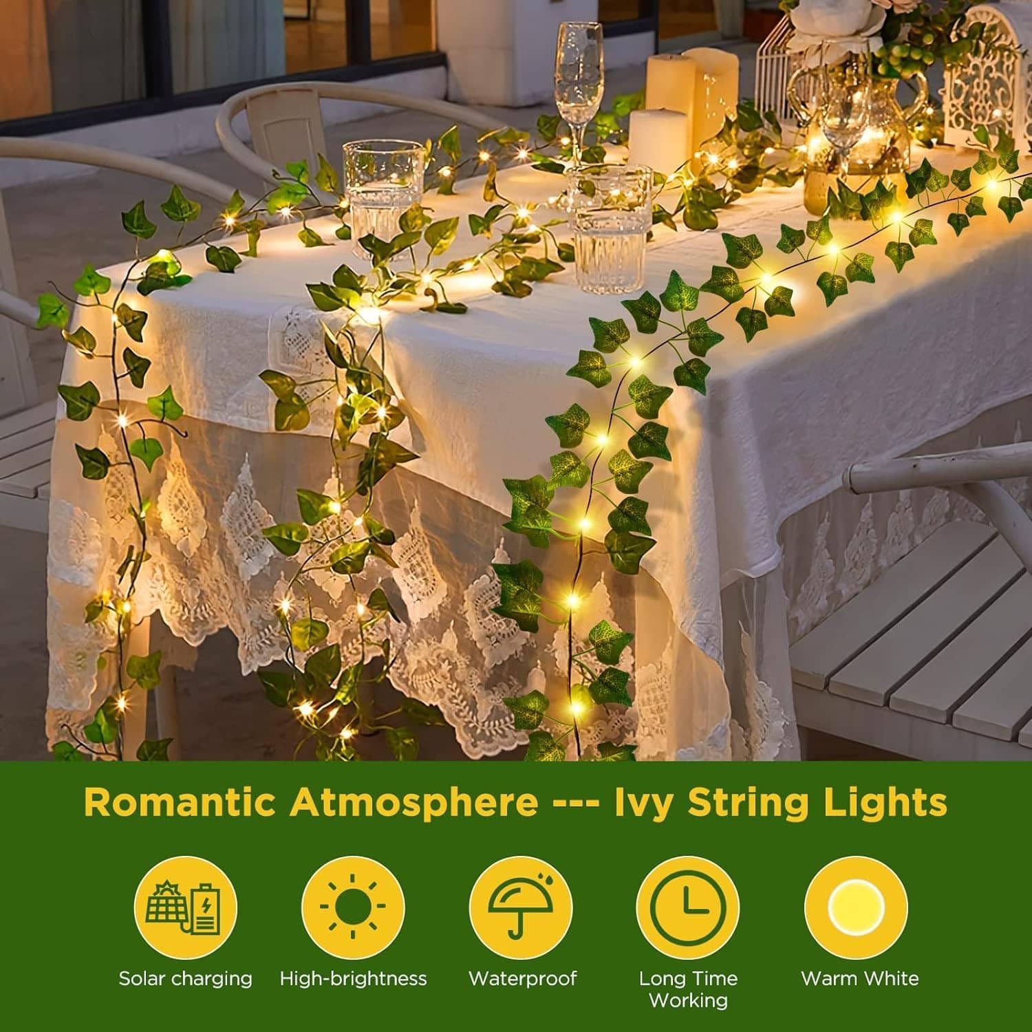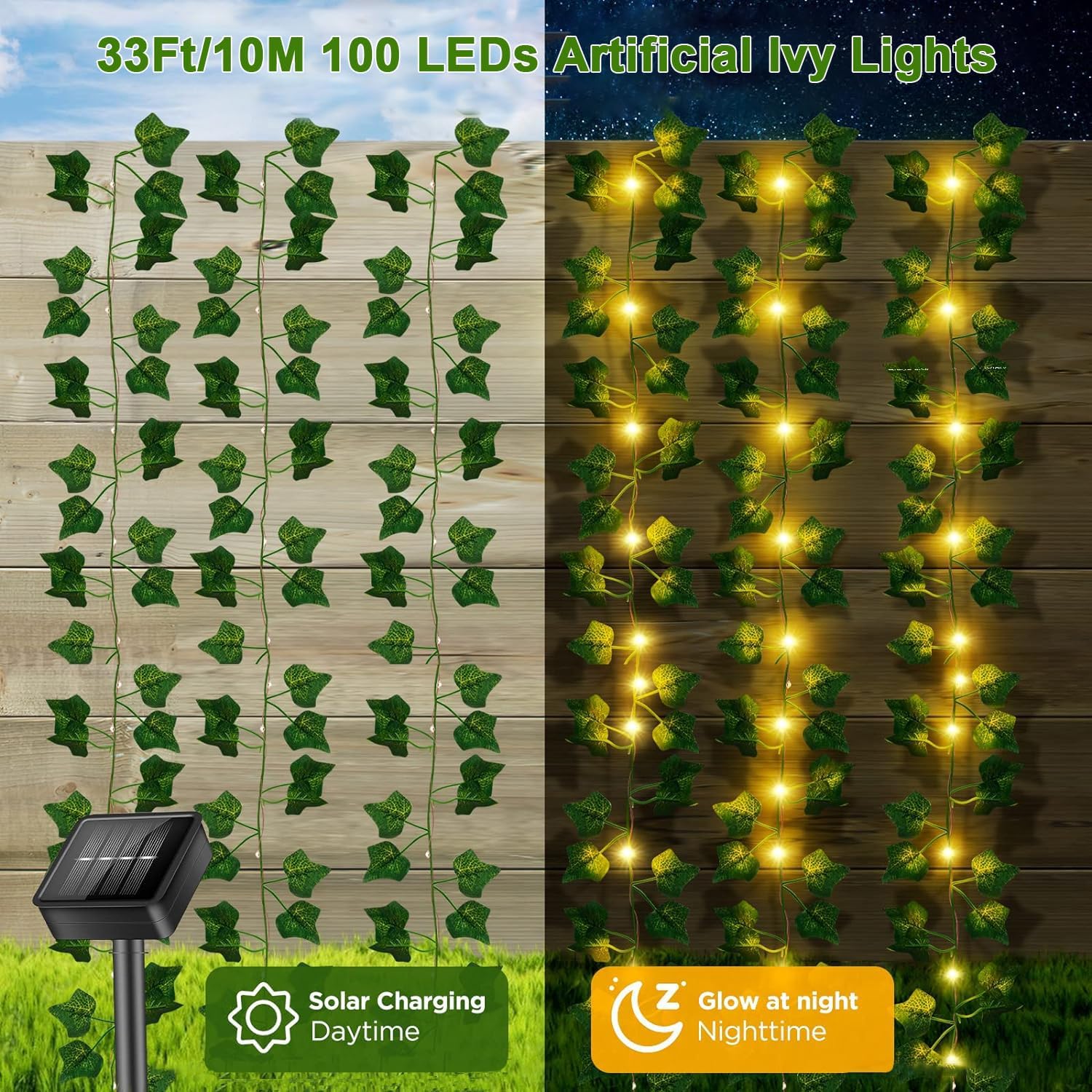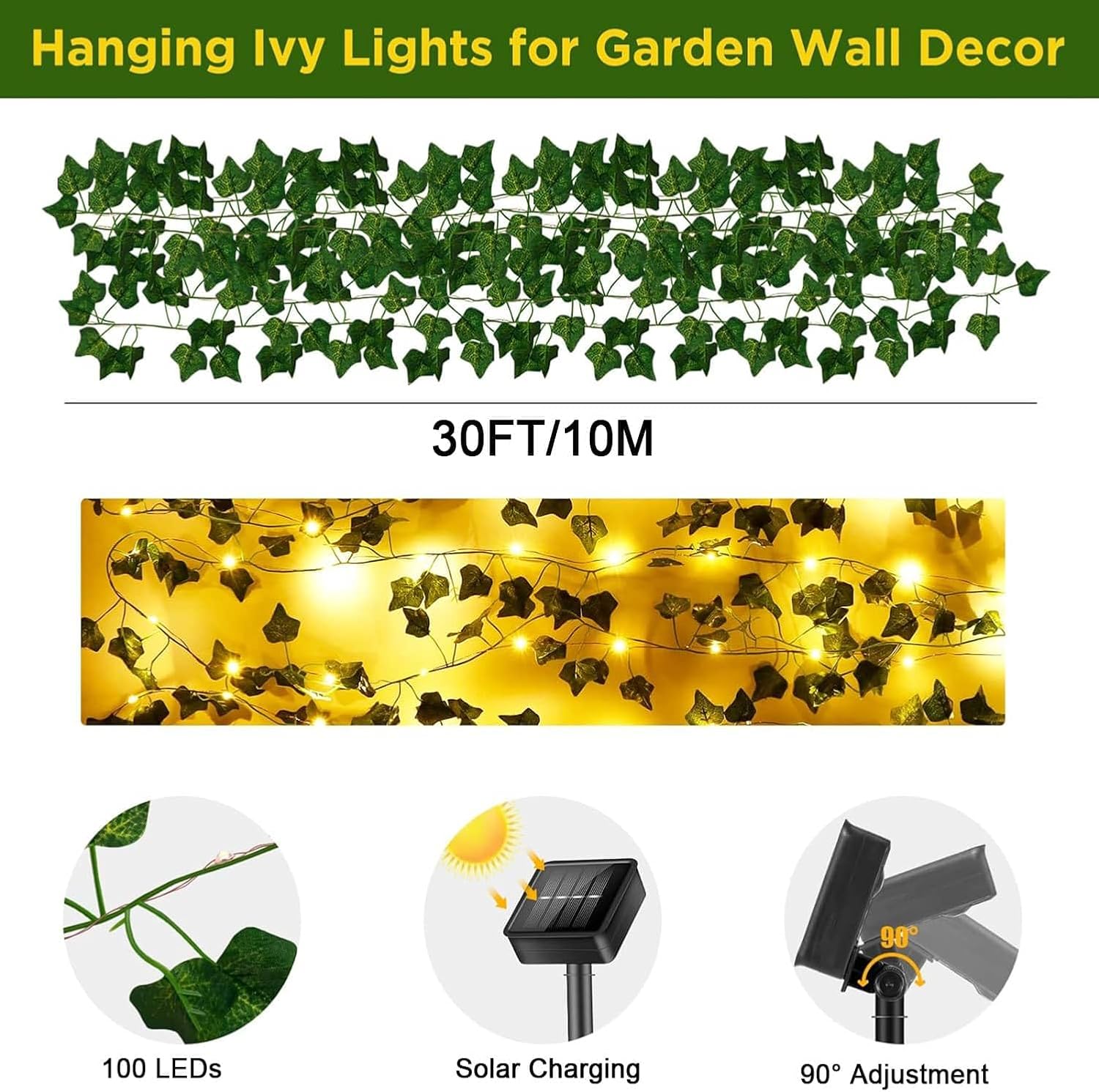 Solar Light - The 100 LED artificial ivy garland consists of 10m faux ivy and 10m copper wire which is already attached to the ivy, no further assembly is required. Transparent light wires are naturally hidden in the foliage, creating an amazing atmosphere in your garden.