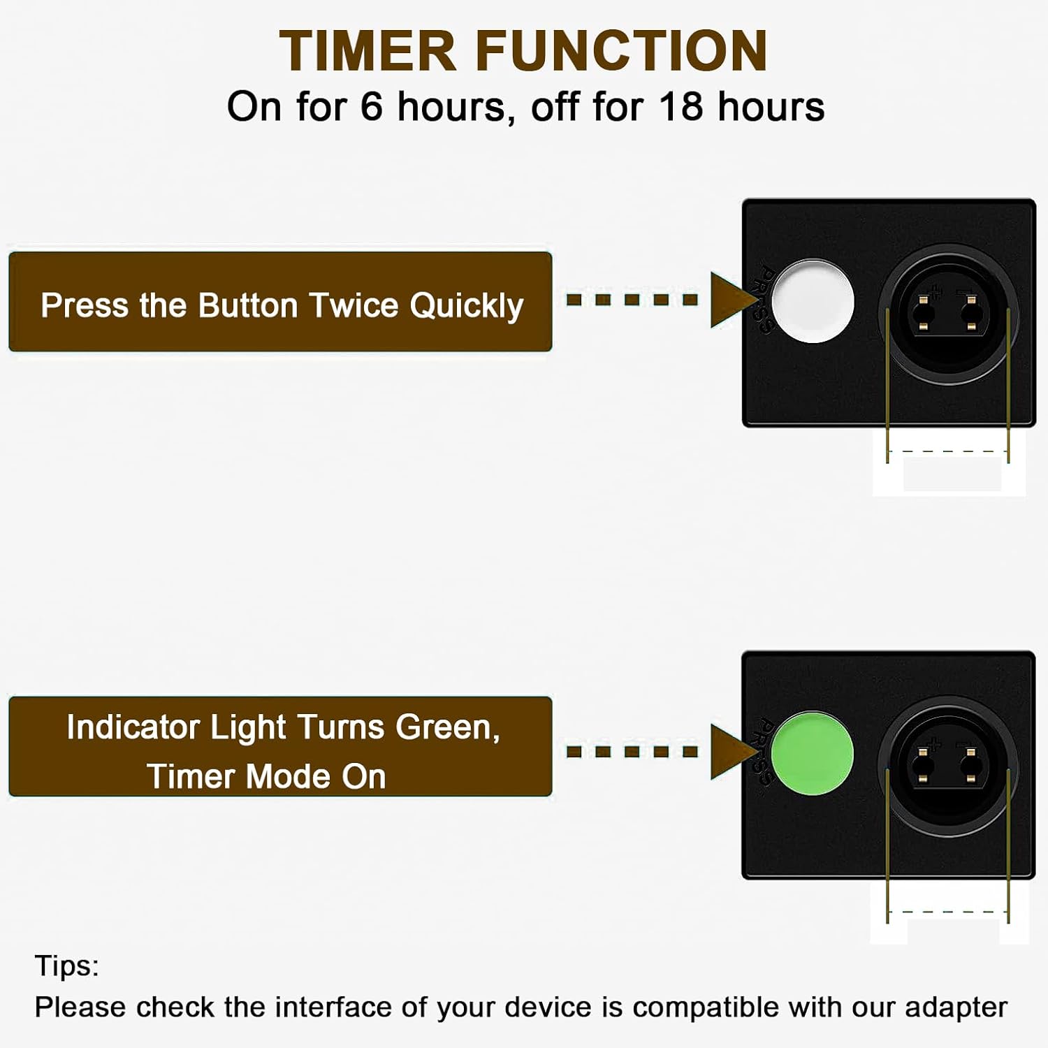 Timer & Memory Function: To set or cancel the timing function, please quickly press the switch twice, the indicator light turns green, the timing mode is on (6 hours on/18 hours off), the indicator light is off, and the timing mode is off. The memory chip can save the last mode setting without resetting the mode every time